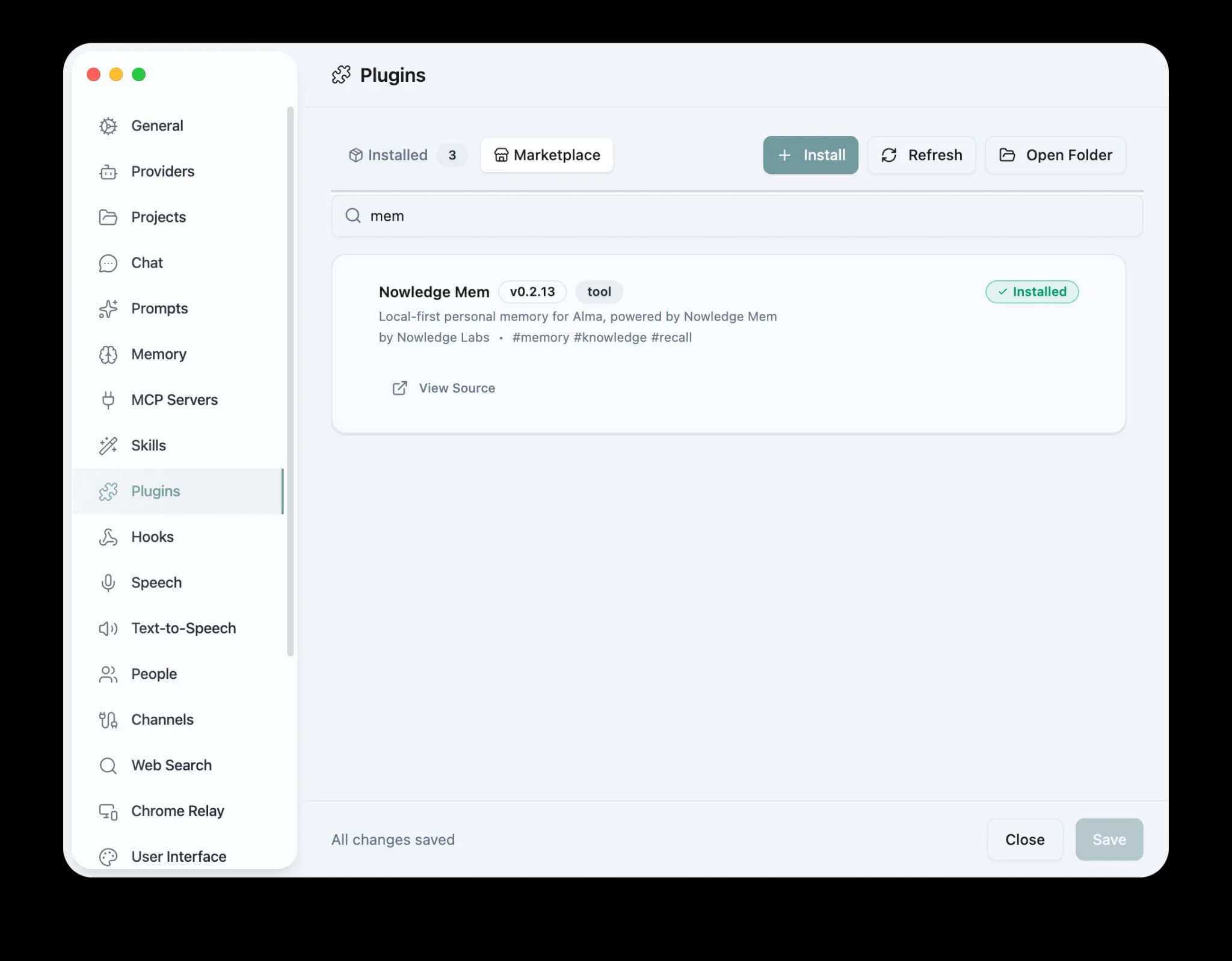 In Alma, open Settings > Plugins > Marketplace, search for Nowledge Mem, and click Install. Restart Alma if needed.